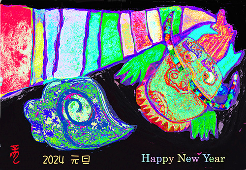 | 今回、驚いたことがまだあって、何と毎年お出ししていた年賀状を大切にファイルして飾って下さっている方が三人もいらっしゃったこと。長男が5、6歳の頃に描いた兎や龍を僕がPCに取り込んでCG化した、謂わば親子のコラボ作品。みなさん絶賛して下さり、毎年楽しみにして下さっているということで嬉しい限り♬ | ||||||||||||||||||||||||||