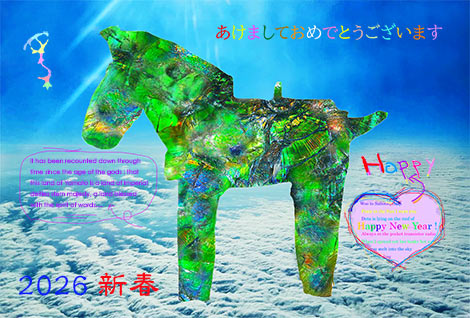 | アンモライトは、この腐食した古代ガラスより派手で美しい。以前から、一度使ってみたいと思っていた。LINEで、みな様に年賀状の素材で創作したアニメーションを送ったところ、「奇麗な馬」ですねぇといった返信が多かった。どなたも、アンモライトとは気付かずに??といった感じだったのではとニンマリしています(^^♪ 背景は、今年がヤバそうな年になりそうなので明るく未来を照らすような青空を選びました。 |